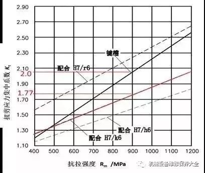 當(dāng)軸斷裂部位正好是聯(lián)軸器同軸過(guò)盈配合的邊緣處,過(guò)盈配合對(duì)軸的強(qiáng)度影響很大。可見(jiàn):過(guò)盈配合H7/r6 的應(yīng)力集中系數(shù)可達(dá)2.2以上;過(guò)盈配合H7/k6的應(yīng)力集中系數(shù)約為1.77;高速軸常用的過(guò)盈配合H7/m6的應(yīng)力集中系數(shù)不會(huì)小于1.8。因此,高速軸就容易在聯(lián)軸器與軸過(guò)盈配合邊緣處斷裂了。