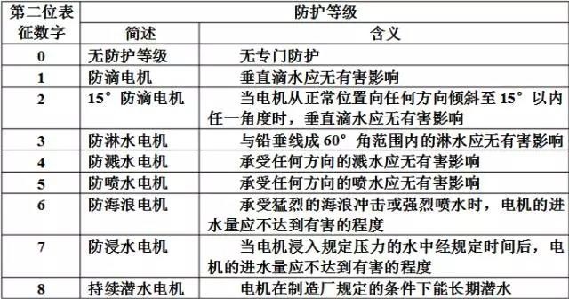 防護標志由字母IP和兩個表示防護等級的表征數字組成。第一位數字表示:防止人體觸及或接近殼內帶電部分和觸及殼內轉動部件(光滑的旋轉軸和類似部件除外),以及防止固體異物進入電機(表示防塵等級)。第二位數字表示:防止由于電機進水而引起的有害影響(表示防水等級)。