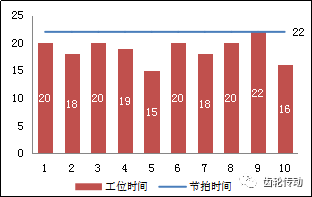 在流動生產作業中,一旦產生瓶頸工序,將使前道工序的產品無法向下流轉,后道工序無產品可做,就會造成生產的局部停滯,直接影響產能。因此為了盡可能地使各工序達到最接近均衡的狀態,需要采用如下步驟去分析和改善:(1)按順序記錄各生產工序內容;(2)測量各工序作業時間并記錄;(3)清點確定各工序人數并記錄;(4)根據工序時間畫出柱狀圖并標識;(5)編制工序平衡表與工序平衡圖,如圖8所示。
