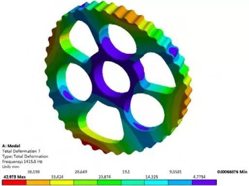 自由模態分析求解的是擺線輪在不施加任何約束狀態下的固有特性。由于在自由狀態下,前6 階模態屬于剛體位移模態,固有頻率為 0[8],所以在分析過程中不加以考慮。因此取 7 ~20階的頻率與振型進行分析。得到的固有頻率和最大位移如表 2 所示。第 7、9 、10、14、5、17 階振型云圖如圖 3~圖 8 所示。
