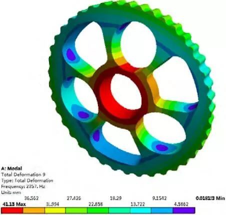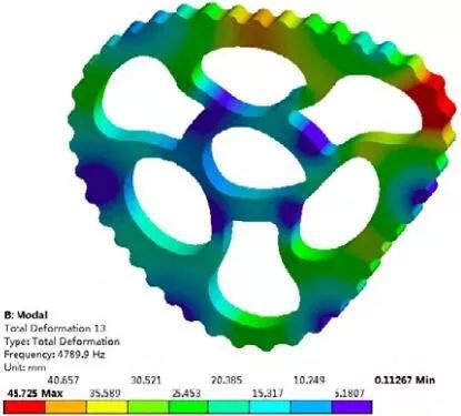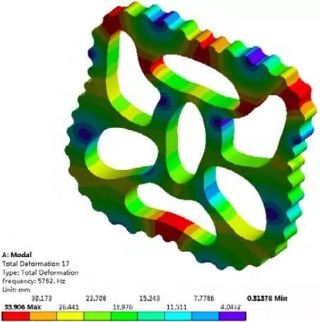從表 2 中數據可以看出,相鄰階出現頻率相近甚至相等的情況。如 7 和 8、10 和 11 、15和 16,說明它們是系統振動方程解的重根。由振型云圖可見,第 階振型中擺線輪繞 X 軸向發生彎曲變形;第 9 階振型中心孔沿 Z 軸正向發生嚴重了伸縮變形;第 10 階振型沿 Y 軸方向發生了嚴重的伸縮變形;第 14 階振型中三個扇形輸出軸孔沿中心孔方向發生了嚴重的伸縮變形;第 15 階振型中心孔沿 X 軸正向與 Y 軸正向角分線方向發生嚴重的扭轉變形;第 17 階振型擺線輪沿 X 軸和 Y 軸方向均發生嚴重的伸縮變形。