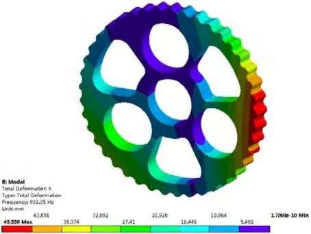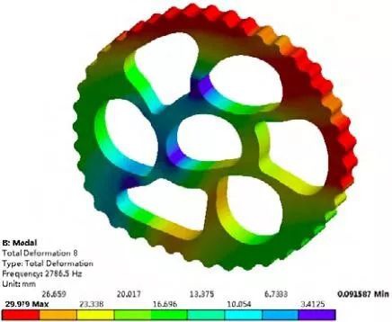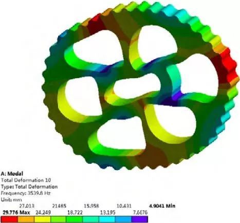 約束模態分析是通過建立約束條件來反映零件之間的相互約束關系,能夠近似的反映擺線輪在實際工作情況下的動態性能。擺線輪在運動過程中,與中間孔的輸入軸無相互接觸,而是主要受到與之配合安裝的 3 個轉臂軸承的作用,且轉臂軸承與擺線輪相互作用的面積一般小于整體接觸面積的一半。因此選擇接觸面積的一半施加軸向和徑向約束。取前 20 階模態計算結果,得到固有頻率和最大位移如表 3 所示。第 3、6、8、13、15、19 階的振型云圖如圖 9~圖 14 所示。
