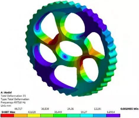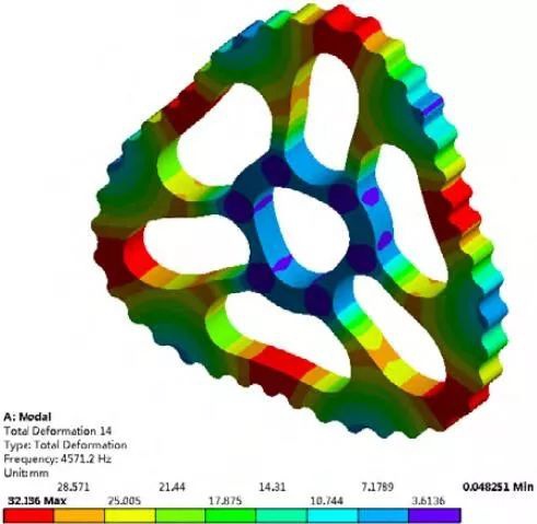 從自由模態整體變形情況分析,擺線輪從1階~20 階的振型變化依次了經過剛性振動階段、整體彈性振動階段和局部彈性振動階段,而從約束模態變形情況分析,擺線輪的變形跳過了整體彈性振動階段,即從剛性振動階段直接轉移至局部彈性振動階段,這也是由于約束模態情況下擺線輪整體剛度分布不均勻導致的。