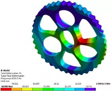 由于低階振型對結構的影響最大,本文在0~2000 Hz 范圍內找到了 673.19 Hz、755.95 Hz、932.35 Hz、1489.7 Hz、1719.1 Hz、1733.2 Hz 的 6 階主振型,因此在對 RV 減速機進行設計或選擇與之配合使用的電機時應該避開這些頻率,以避免共振現象的發生。由振型云圖可以看出:擺線輪的變形主要發生在擺線輪廓處和各孔位之間的連接處,因此在設計時可以適當提高變形較大處的剛度,減少變形過大帶來的結構損傷。