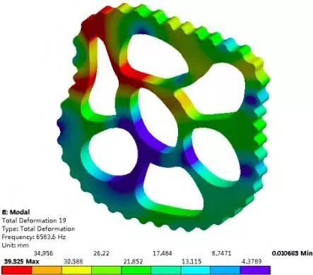 由振型云圖可見,第 3 階振型 X 軸正向外沿處發生彎曲變形;第 6 階振型上端兩輸出軸孔位外沿發生 Y 軸正向的彎曲變形;第 8 階振型中左上端輸出軸孔外沿向中心孔發生伸縮變形,同時中心孔繞 Z 軸發生了扭轉變形;第 13階振型中三個軸承孔分別沿中心孔方向發生了嚴重的伸縮變形;第 15 階振型中心孔沿 Y 軸發生了扭轉變形和伸縮變形;第 19 階振型中心孔沿 Y 軸發生了扭轉變形,同時擺線輪外沿沿 X 軸和 Y 軸向中心孔發生了嚴重的伸縮變形。
