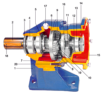 01.減速機本體Housing 02.出力軸Output Shaft 03.出力軸油封Oil Seal-Output Shaft 04.出力軸承Bearing-Output Shaft 05.太陽螺帽Sun Nut 06.游星架Planetary Carrier 07.內齒環Internal Gear Ring 08.游星齒輪Planetary Gear 09.階段齒輪Using Connected Section's Gear 10.滾針軸Needle Roller Pin 11.太陽齒輪Sun Gear Input Shaft 12.C型扣環Snap Ring 13.入力軸承Bearlng-lntpLrt Shaft 14.入力軸油封Oil Seal-Input Shaft 15.人力法蘭Input Ftange 16.O型環O-Ring 17.透氣塞Breather Plug 18.輸出軸鍵Key-Output Shaft 19.墊圈Washer 20.內六角螺絲Hex Socket Cap Screw