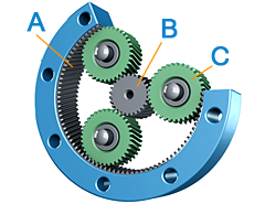 行星式齒輪減速器由一個內齒環(A)緊密結合于齒箱殼體上,環齒中心有一個自外部動力所驅動之太陽齒輪(B)介于兩者之間有一組由三顆齒輪等分組合于托盤上之行星齒輪組(C)該組行星齒輪依靠著出力軸、內齒環及太陽齒支撐浮游于期間;當入力側動力驅動太陽齒時,可帶動行星齒輪自轉,并依循著內齒環之軌跡沿著中心公轉,行星之旋轉帶動連結于托盤之出力軸輸出動力。