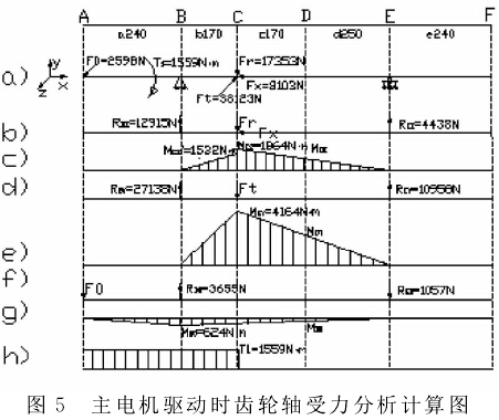 齒輪軸支承位置和軸受載荷大小、方向、作用點及載荷種類已明確,支點反力及彎矩可求得,進而按彎矩合成理論進行計算。計算時,將軸當作置于鉸鏈支座上的梁。軸上零件傳來的力作為集中力,其作用點取為零件輪緣寬度的中點。軸上轉矩相應從輪轂寬度的中點計算。作用在軸上的各載荷不在同一平面內時,分解到兩個相互垂直的平面上,然后分別求出兩平面內的彎矩,再按失量合成法求得合成彎矩。主電機驅動時齒輪軸受力分析計算結果如圖5所示。