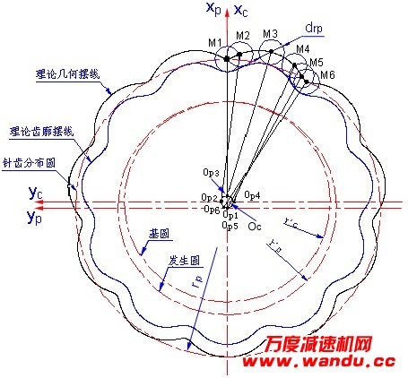 Fig.14-2 以理論幾何擺線曲線上的任意點為圓心,以針齒半徑rrp(直徑drp)畫出一系列等圓,由此一系列等圓所包絡出來的內側等距曲線可以作為擺線輪的齒廓。從擺線輪、針齒兩者組成的嚙合關系可知,基園與發生圓的切點始終是傳動節點,而基園是擺線輪的節圓,發生圓是針輪的節圓。 擺線輪節圓上的分齒周節為: p = 2π(rp'-rc') = 2πa; 按分齒周節進行分度,分別得到擺線齒數Zc和針齒數Zp:
