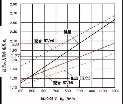 軸受純扭轉時,鍵槽和配合邊緣處的有效應力集中系數Kτ見圖7所示。當軸的抗拉強度Rm=900MPa時,鍵槽的有效應力集中系數Kτ=2。因此鍵槽對軸的削弱是很大的。