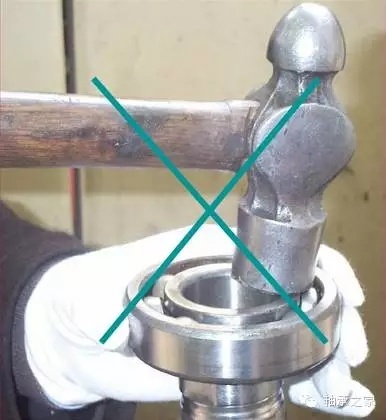 安裝內圈(或外圈)過盈配合的軸承,禁止用鐵錘直接敲擊軸承內圈(或外圈)端面,這樣很容易把擋邊敲壞。應該采用套筒放在內圈(或外圈)端面上,用鐵錘敲擊套筒來安裝。