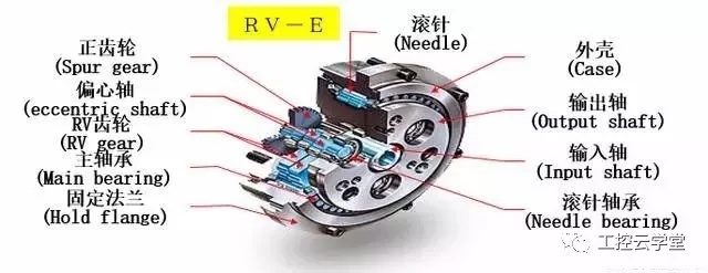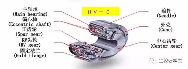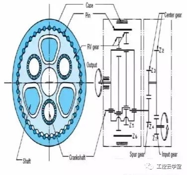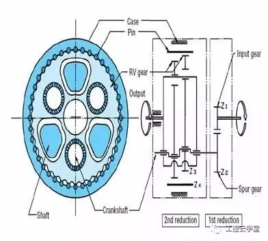 在外殼的內環圈內裝有圓柱形的滾針,RV齒輪的偏心運動引起滾針與擺線形RV輪齒的嚙合和脫離,產生多組RV輪齒與滾針同時嚙合,提高負載能力。 由于RV齒數比滾針少1個數目,因此當偏心軸旋轉一周時,如果固定外殼 (case),則RV齒輪與輸入軸同向轉1個齒的角度。