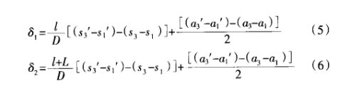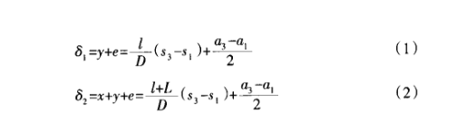 根據(jù)三角關(guān)系得出:若要兩軸對(duì)中,主動(dòng)機(jī)支座1須加占:厚的墊片,支座2須加52厚的墊片。其中,D為聯(lián)軸器的計(jì)算直徑,L為主動(dòng)機(jī)兩支座之間距離,l為主動(dòng)機(jī)支座1到半聯(lián)軸器之間距離,可得公式(1)和(2):