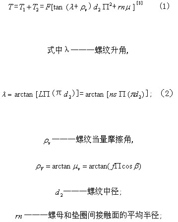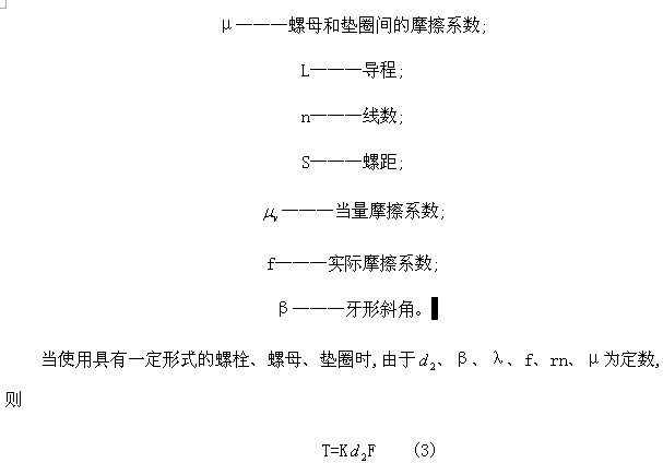 式中 K———擰緊力矩系數(shù)。從式(中可以看出T與F成正比并且力矩系數(shù)的取值是直接影響螺栓聯(lián)接安裝質(zhì)量的重要因素。設(shè)計時,為使聯(lián)接可靠和安全,對重要部位螺栓的緊固力矩應(yīng)作出具體詳細的規(guī)定。其力矩適當,既不能過大,也不能過小。過大將使螺栓產(chǎn)生永久性變形以至斷裂或螺紋變形脫扣,過小螺栓容易動脫落,發(fā)生安全事故;對重要聯(lián)接應(yīng)作受力分析,根據(jù)受力情況確定F值,再根據(jù)F值的大小選擇聯(lián)接螺栓和螺母(在有關(guān)緊固件標準中給出了螺栓和螺母的最小拉力載荷或保證載荷),在選定聯(lián)接件后,根據(jù)T=Kd2F可以確定合適的擰緊力矩。裝配時只要擰緊到設(shè)計時確定的擰緊力矩,使螺栓取得準確的軸向預(yù)緊力,則螺栓在工作時既能承受施加在螺栓上的力,又不致于出現(xiàn)螺栓變形、斷裂和松動等缺陷。因此提高了緊固件在工作條件下的可靠性和安全性。