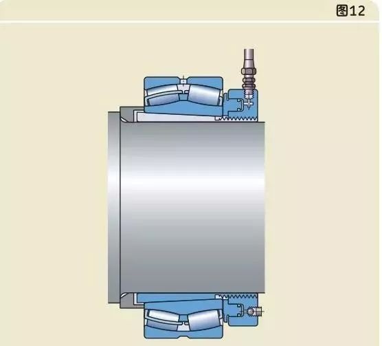 較大軸承需要更大的力來安裝,因此應使用液壓螺母。液壓螺母可以把圓錐孔軸承安裝在圓錐形軸徑上(圖11),緊定套上(圖12),退卸套上(圖13)。