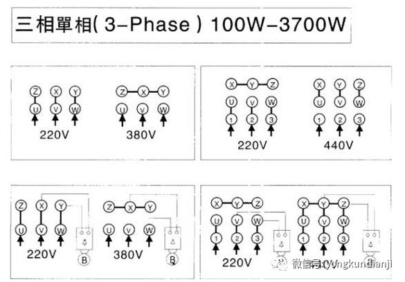 上面的圖分別是普通的三相380,220V和三相440,220V的接線方式。下面的圖分別是帶剎車的三相380,220V和三相440,220V的接線方式。