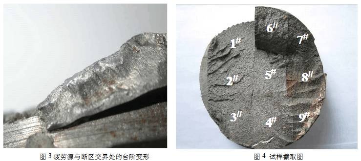 斷口微觀結果顯示,疲勞源由機加工刀痕而起,并由此擴展;終斷區組織為準解理沿晶的脆性斷裂組織。