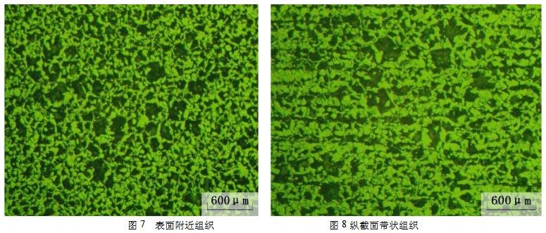輸出軸縱截面上組織呈帶狀組織、局部(即近表面)組織中的鐵素體呈網狀、針狀分布,仍與鍛后的熱處理工藝相關。帶狀組織的存在使輸出軸的力學性能形成各向異性,降低了輸出軸的塑性、沖擊韌性和斷面收縮率等。