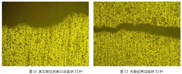 內裂紋多為沿晶和穿晶裂紋,裂紋兩邊局部的組織晶粒度稍有差異(見圖12)。