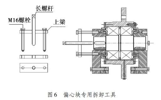 首先充分利用偏心塊側面上螺紋孔,使用2根M16普通螺栓。拆卸工具上梁采用Q235材料厚度為16mm的鋼板,在中心位置加工成普通M20的螺紋孔,兩側鉆與偏心塊聯結螺栓中心距相配的通孔,另加工一根普通M20的長螺桿與上梁中心螺紋孔相配合,將各零件裝配成為簡單的偏心塊拆卸工具。此拆卸專用工具對材料沒有特殊要求,制造簡單,使用方便。