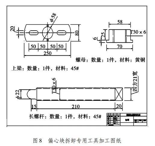 (4)黃銅螺母底部帶6mm的臺階用于和上梁板裝配時的定位,和承受拆卸力矩。改進后偏心塊拆卸專用工具圖紙如圖7,加工圖如圖8所示。