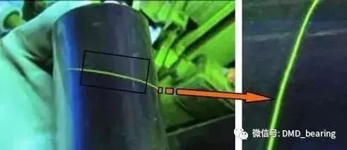 最好采用熒光磁粉進行探傷,使缺陷顯示更為清晰、直觀。鍛造折疊的磁痕一般與表面成一定角度的線狀、溝狀及魚鱗片狀,如圖1所示。