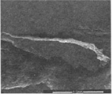 通過對失效齒輪宏觀觀察發現.在嚙合受力齒面的節線附近靠近齒根一側,沿齒寬方向分布許多剝落坑,剝落坑附近有許多點蝕坑,這些點蝕剝落坑再吃款方向上基本連成一線,形成由點蝕剝落?坑組成的凹坑帶,基本與齒寬同長(圖1)。經掃描電鏡觀察,失效齒輪的點蝕剝落坑帶上有較多面積在2mmz以上剝落坑,剝落坑最大深度為0.8mm,剝落坑底部有較淺的疲勞輝紋,底部大致與表面平行(圖2)。剝落坑側面一側大致與表面成45°角,另一側約垂直于表面,剝落部分一端與齒輪基體分離,形成懸臂梁(圖3)。通過對齒輪磨損面的分析,發現失效齒輪具有典型的接觸疲勞特征,?而且齒輪節線附近偏向齒根一側的接觸疲勞較為嚴重。