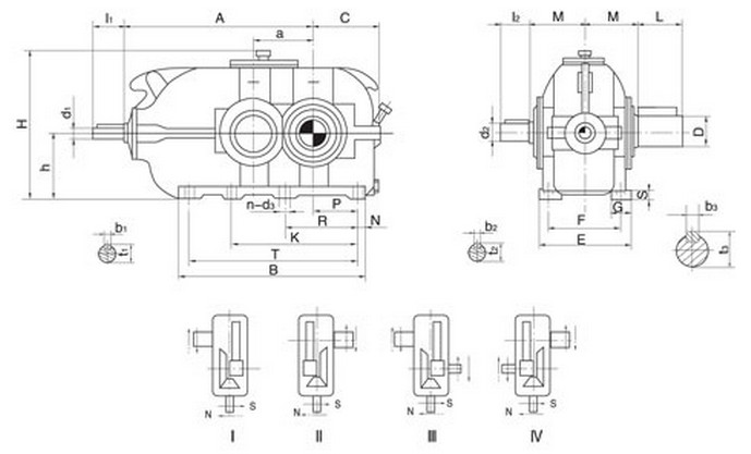 DBY、DBYK、DBZ型減速機各有12種規格,名義中心距為:160,180,200,224,250,280,315,355,400,450,500,560mm每種規格均有5種傳動比(8,10,11.2,12.5,14)兩種旋向,四種裝配型式,分別組成240種減速機。