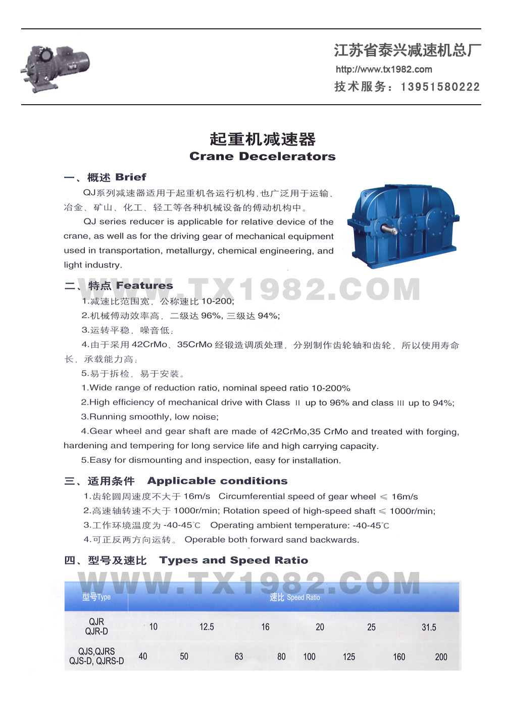 QJ系列減速器適用于起重機各有開機構,也廣泛用于遠輸、冶金、礦山、化工、輕工等各種機械設備搏動機構中